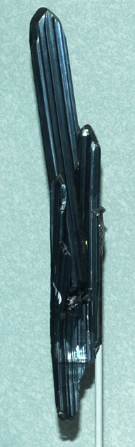 This sample of stibnite is about 16 cm wide. It is from the Ichinokawa mine, Ehime, Japan.  This is an example of a twisted crystal of stibnite. It is from Ichinokawa mine, Ehime, Japan. |