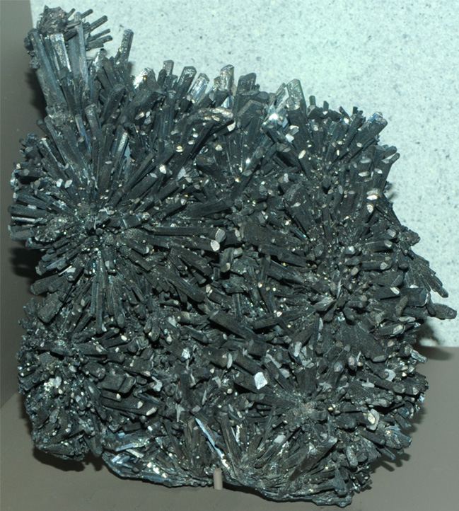 These samples of stibnite are displayed in the Smithsonian Museum of Natural History. Stibnite is a sulfide mineral of antimony. It has the composition Sb2S3(OH) or Sb2S3. The left sample is about 4x25 cm and is from Ichinokawa mine, Ehime, Japan.