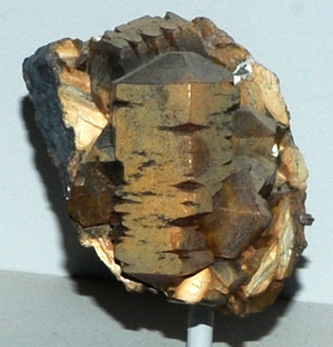 This sample of sturmanite is displayed in the Smithsonian Museum of Natural History. Sturmanite is a sulphate mineral which contains boron. It has the composition Ca6(Fe,Al,Mn)2SO4[B(OH)4](OH)12.25H2O. This sample is about 3 cm wide and is from N'Chwaning mine, Hotazel, Cape Province, South Africa.