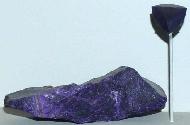 This sample of sugilite is displayed in the Smithsonian Museum of Natural History. Sugilite is a silicate mineral which contains lithium. It has the composition KNa2Li3(Fe,Mn,Al)2Si12O30. This sample is about 10 cm long and the gem is 23.5 carats. It is from Kalahari Desert, Cape Province, South Africa.