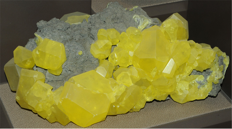 Sulfur often occurs in almost pure form, but large crystals like this are rare. This sample, displayed in the Smithsonian Museum of Natural History, originated in Cozzodizi, Agrigento, Sicilia, Italy. The sample is 8-10cm across.