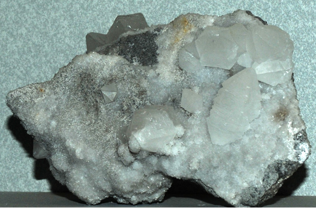 This sample of Witherite is displayed in the Smithsonian Museum of Natural History. Witherite is a carbonate mineral which contains barium with the composition BaCO3. This sample is about 11x6 cm and is from Alston Moor, Cumbria, England. In this sample it is appears together with alstonite.