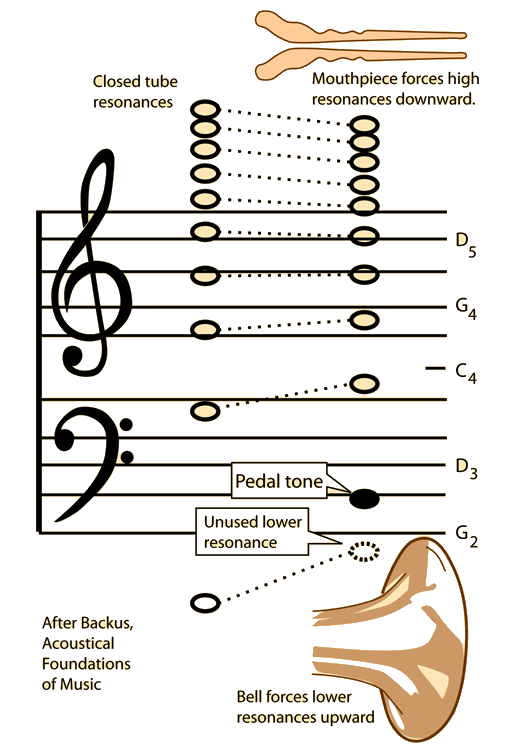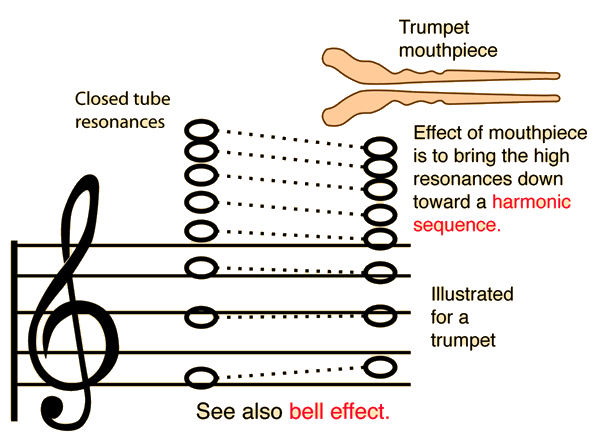 | The Mouthpiece EffectThe mouthpiece of a brass instument contributes to bringing the resonances into a harmonic sequence by bringing the high resonances down with respect to the resonances of a closed tube. The mouthpiece acts like a cavity resonator, and as the played frequency approaches this resonant frequency, the effective length of the tube becomes greater (approaching the tube length which would give that same resonant frequency. This increases the effective length for high frequencies lowering the high resonant frequencies.