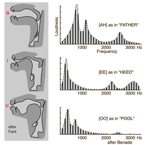 | Forming the Vowel SoundsThe vocal resonances are altered by the articulators to form distinguishable vowel sounds. The peaks in the vowel spectra are called vocal formants. Note the prominent role of the tongue in this process. The jaw position and lips also play a major part.  The sketches at left above are adapted from Gunnar Fant's "Acoustic theory of speech production" and are reportedly sketches taken from x-rays of the head during the production of these sounds. These are the vowels classified as IPA [a], [i], and [u] and roughly correlate with the vowels represented in the spectra from Benade. The emphasis should be on "roughly" since I don't know how close the correlation is. The intent here is to illustrate the role of the articulators and to point to the fact that their action has a major influence on the harmonic content of the voiced sounds. The normal ear is able to clearly distinguish those differences.