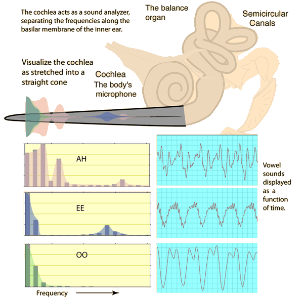 The inner ear acts as a sophisticated sound analyzer, spreading out the energy content of the sound as a function of frequency. As shown here for three vowel sounds, the result is a distinguishable pattern of excitation on the basilar membrane of the cochlea. This permits the clear distinguishing of vocal sounds even if they have identical pitch and loudness.