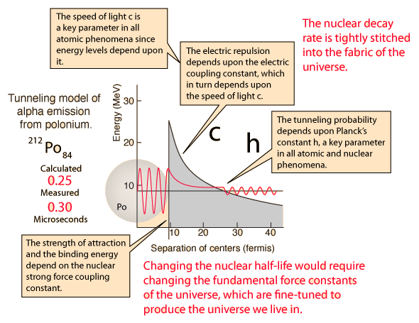 | What could you do to change the polonium half-life?For the modeling of the alpha decay half-life of polonium-212 with the tunneling probability, a value of 0.25 microseconds was obtained. This is surprisingly close to the measured value of 0.3 microseconds, considering that an incorrect barrier can take you off many orders of magnitude. It suggests that the major factors affecting such alpha decay have been accounted for in a reasonable manner. What could you do to change the polonium half-life? The answer is that there is no way to experimentally change that parameter because it ultimately depends upon the values of fundamental physical constants. The illustration below points out that the characteristics which affect the barrier and the tunneling probability are:
