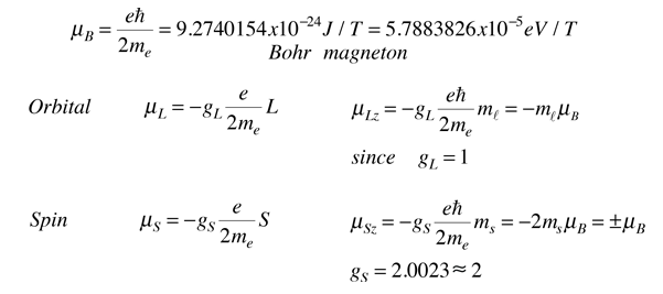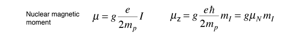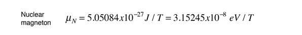 Nuclear Magnetic MomentsAssociated with each nuclear spin is a magnetic moment which is associated with the angular momentum of the nucleus. It is common practice to express these magnetic moments in terms of the nuclear spin in a manner parallel to the treatment of the magnetic moments of electron spin and electron orbital angular momentum. For the electron spin and orbital cases, the magnetic moments are expressed in terms of a unit called a Bohr magneton which arises naturally in the treatment of quantized angular momentum. ![]() Generally, the measured quantity is proportional to the z-component of the magnetic moment (the component along the experimentally determined direction such as the direction of an applied magnetic field, etc. ). In this treatment, the use of a "gyromagnetic ratio" or "g-factor" is introduced. The g-factor for orbital is just gL = 1, but the electron spin g-factor is approximately gS = 2. For the nuclear case we proceed in a parallel manner. The nuclear magnetic moment is expressed in terms of the nuclear spin in the form ![]() where we have now introduced a new unit called a nuclear magneton. ![]() For free protons and neutrons with spin I =1/2, the magnetic moments are of the form ![]() where Proton: g = 5.5856947 In 2014 a direct measurement of the magnetic moment of the proton gave 2.792847350(9) nuclear magnetons. (Mooser et al, Nature, May 29, 2014). Efforts are underway to measure the magnetic moment of the antiproton with comparable accuracy, since a measured difference between the proton and antiproton could be a valuable clue toward unraveling the mystery of why matter greatly dominates antimatter in the universe (antimatter problem). Neutron: g = -3.8260837 +/- 0.0000018 The proton g-factor is far from the gS = 2 for the electron, and even the uncharged neutron has a sizable magnetic moment! For the neutron, this suggests that there is internal structure involving the movement of charged particles, even though the net charge of the neutron is zero. If g=2 were an expected value for the proton and g=0 were expected for the neutron, then it was noted by early researchers that the the proton g-factor is 3.6 units above its expected value and the neutron value is 3.8 units below its expected value. This approximate symmetry was used in trial models of the magnetic moment, and in retrospect is taken as an indication of the internal structure of quarks in the standard model of the proton and neutron. Note that the maximum effective magnetic moment of a nucleus in nuclear magnetons will be the g-factor multiplied by the nuclear spin. For a proton with g = 5.5857 the quoted magnetic moment is μ = 2.7928 nuclear magnetons.