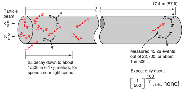 Cronin and Fitch Experiment with KaonsIn the study of neutral kaons, two particle species were found, having apparently identical masses but very different lifetimes. These particles have different decay modes. ![]() In 1964, Cronin and Fitch performed a beam experiment in which they measured the decay of pions at the end of a 57 foot beamline. Given the disparity of the lifetimes of the two kaon species, you expect to see only the long-lived version at the end of the beam tube, but they found about 1 in 500 decays to be 2-pion decays, characteristic of the short-lived species. ![]() The short-lived particle should not be observable more than a few centimeters down the beam line. To show that, suppose we calculate the time required to drop to 1/500 the original population. With the stated lifetime, the halflife calculation gives a time of 5.5 x 10-10 seconds. At nearly the speed of light, this would give a distance of about 17 centimeters, only 1/100 the length of Cronin and Fitch's beam tube. The problem with this number is that it ignores relativistic time dilation, and the lifetime as seen in the laboratory frame is dilated by the relativity factor γ (at 0.98c, γ =5). The revised distance is then 17γ cm, so even at 0.98c the population would be down by a factor of 500 by the time you got a meter down the beam tube. So for any expected particle velocity, you would expect all of them to have decayed long before you get to the end of the beam line. This experiment showed that there was a small CP violation in the kaon decay, so the kaon has played a central role in the discussions of these symmetries since that time.