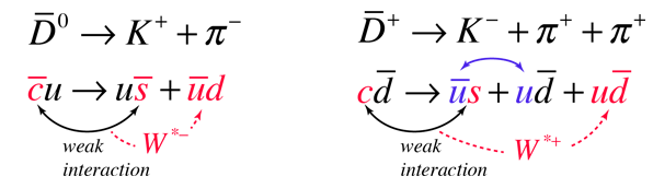 An interesting example of a particle interaction which involves the D meson was observed in a bubble chamber at SLAC in 1982 (K. Abe et al., Phys. Rev. Lett. 48,1526 (1982)). Photons at about 20 GeV were produced by Compton scattering of radiation from a YAG laser from energetic electrons from the linear accelerator. The interaction is sketched from the bubble chamber photograph. The presumption is that the photon interacted with a proton, producing the D mesons indicated. The reaction which produced these products would appear to be the following. ![]() The reaction can be analyzed by examining the quark content of the products, and is seen to involve the production of a charm-anticharm quark pair. From the bubble chamber tracks, it can be seen that the neutral D meson decays into two products and the positive D meson decays into three. While the specific products can not be identified with just this photograph, it is interesting to propose possibilities for this process. The decays shown below are one possibility. ![]() Since the D meson is the lightest meson which contains a charm quark, it must change that charm quark to some other quark in order to decay. Transmutations of quarks occurs by the weak interaction, which changes the charm quark to a strange quark with a W particle. This weak interaction process is indicated in both of the decays above. For the particular decay proposed for the positive D meson, an up-antiup quark pair is also required. There are many possible decay processes for the D meson because it has a lot of excess mass energy. These all involve the weak interaction to change the charm quark, and the variety of W decays provide many paths for the process. 2011 reports from the Beauty detector of the Large Hadron Collider suggest that D-mesons seem to decay slightly differently from their antiparticles. The LHCb team reported a difference of about 0.8 percent - a significant difference that, if true, could herald the first "new physics" to be found at the LHC.