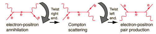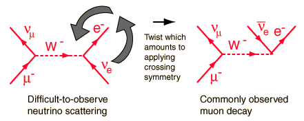 Twisted Feynman Diagrams and Crossing SymmetryOnce you have constructed a Feynman diagram for a particular particle interaction, you can then predict other interactions by rotating and/or twisting the diagram. ![]() This feature of Feynman diagrams is particularly useful for charged weak interactions. In that case interactions can be constructed from the weak interaction Feynman diagrams, but the interactions that are often observed are twisted versions of the interactions constructed from the primitive vertices. A good example is the development of the Feynman diagram for muon decay. ![]() From the primitive vertices we construct the interaction m, ne -> e, nm and then just twist the right end so that the electron neutrino component is an exit particle instead of an entering particle. The process turns the arrow downward, representing the antiparticle, the electron anti-neutrino. This is just the symmetry operation addressed in crossing symmetry. It is generally observed that if a given interaction exists, then the interaction constructed by taking a particle to the other side of the reaction and turning it into its antiparticle will also exist. |