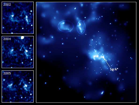 This set of Chandra images shows evidence for a light echo generated by the Milky Way's supermassive black hole, a.k.a. Sagittarius A* (pronounced "A-star"). Astronomers believe a mass equivalent to the planet Mercury was devoured by the black hole about 50 years earlier, causing an X-ray outburst which then reflected off gas clouds near Sagittarius A*. The large image shows a Chandra view of the middle of the Milky Way, with Sagittarius A* labeled. The smaller images show close-ups of the region marked with ellipses. Clear changes in the shapes and brightness of the gas clouds are seen between the 3 different observations in 2002, 2004 and 2005. This behavior agrees with theoretical predictions for a light echo produced by Sagittarius A* and helps rule out other interpretations. While the primary X-rays from the outburst would have reached Earth about 50 years ago, before X-ray observatories were in place to see it, the reflected X-rays took a longer path and arrived in time to be recorded by Chandra.