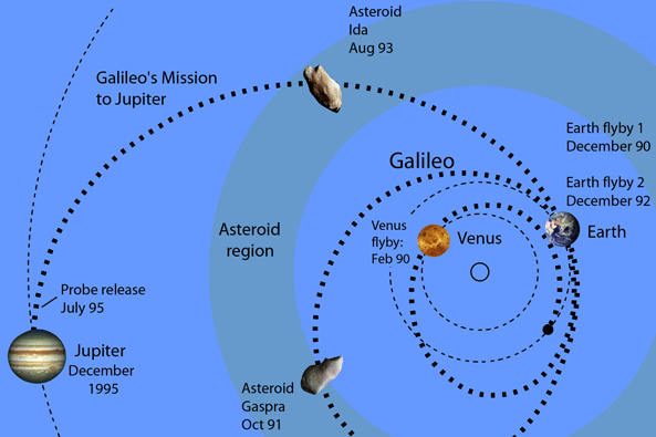 Galileo MissionLaunched on October 19, 1989, the Galileo spacecraft was designed for a study of Jupiter. After six years and about 2.5 billion miles, it reached Jupiter on December 7, 1995. The distance between to orbits of Earth and Jupiter is about 390 million miles. A 23 month survey of the Jupiter system was scheduled. The total cost of the mission is about $1.6 billion. Originally scheduled to be launched from the space shuttle in 1985, it would have been at Jupiter in 1987. Launch delays, the 1986 Challenger disaster, and the movement of the planets put it on a much slower and more circuitous path to Jupiter. Galileo has been boosted in its journey by gravity-assist maneuvers around Venus in 1990, around the Earth in 1990 and 1992, and around the asteroid Gaspra in 1991. It also had a close flyby of the asteroid Ida, at which it discovered a tiny moon of Ida, about 1 mile in diameter. In 1994, Galileo was the only instrument in position to view the actual impacts of Comet Shoemaker-Levy 9 with the surface of Jupiter. The journey of Galileo was plagued with difficulties like the failure of the main antenna to deploy. This forced the rewrite of the spacecraft's onboard software to make use of the backup antenna. An onboard recorder stored information for slower transmission to the Earth from the smaller antenna. The Jupiter probe was separated from the spacecraft in July, 1995 in preparation for the encounter with Jupiter in December. Galileo entered orbit around Jupiter on December 7, 1995.
