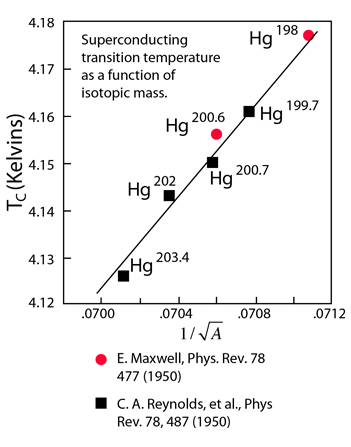 If electrical conduction in mercury were purely electronic, there should be no dependence upon the nuclear masses. This dependence of the critical temperature for superconductivity upon isotopic mass was the first direct evidence for interaction between the electrons and the lattice. This supported the BCS theory of lattice coupling of electron pairs.