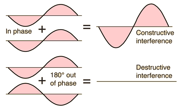 Interference of SoundTwo traveling waves which exist in the same medium will interfere with each other. If their amplitudes add, the interference is said to be constructive interference, and destructive interference if they are "out of phase" and subtract. Patterns of destructive and constructive interference may lead to "dead spots" and "live spots" in auditorium acoustics. Interference of incident and reflected waves is essential to the production of resonant standing waves. Interference has far reaching consequences in sound because of the production of "beats" between two frequencies which interfere with each other.