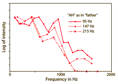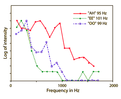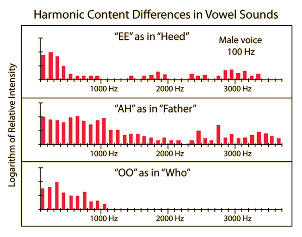 | Harmonic Spectrum ExampleIntensity of harmonics as a function of frequency for different vowel sounds produced at the same pitch: