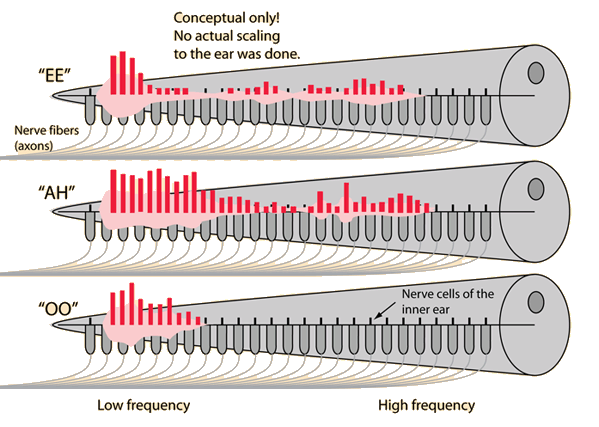 | Different vowel sounds, different patterns of excitation in the inner ear. According to the place theory for pitch perception, different frequency sounds excite the basilar membrane of the inner ear in different places. The high frequencies selectively excite the hair cells near the entry point at the oval window and the low frequencies produce maximum response near the smaller end of the tapering membrane. Since the harmonic content of the different vowel sounds is different, the patterns of excitation of the receptor cells are different.