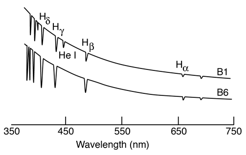 B-Type StarsBlue-white stars with surface temperatures of about 15000K. The ionized helium (HeII) lines of the O-type stars have disappeared and neutral helium (HeI) lines are strongest at B2. The neutral hydrogen (HI) lines are getting stronger and singly ionized OII, SiII and Mg II are visible. A significant rise of the blackbody spectrum toward the blue is still evident. ![]() These are sketches of spectra in Kaufmann. The original data are attributed to G. Jacoby, D. Hunter and C. Christian.