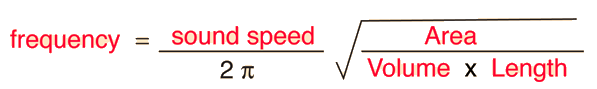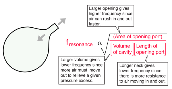 | Cavity ResonanceAn air cavity will exhibit a single resonant frequency. If extra air is pushed into the volume and then released, the pressure will drive it out. But, acting somewhat like a mass on a spring which is pulled down and then released, it will overshoot and produce a slight vacuum in the cavity. The air will oscillate into and out of the container for a few cycles at a natural frequency. The qualitative nature of the frequency determining factors:  Actually the frequency depends upon the square root of these factors and also upon the speed of sound, as you can see in the actual calculation of the frequency. But the above illustration shows the physical factors that are involved in determining the resonant frequency.