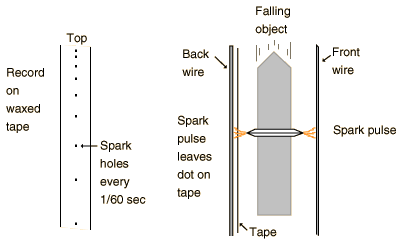 where v2 and v1 are the average velocities over any two successive time intervals t. In this experiment the acceleration of gravity, g, will be determined directly from the motion of a freely falling object using equations 3 and 4. APPARATUS The free-fall apparatus has an electromagnet to hold the object until the record of its fall is to be made. When the switch to the coils of the electromagnet is opened, the magnet can no longer hold the object, and it falls freely into a cup below. A sparking device of known frequency (60 Hz) passes each spark from an outer wire through a conducting metal ring on the object, through a waxed recording tape, and on to a second wire to complete the circuit. The passage of the spark through the waxed tape leaves a small mark or spot on the tape, marking the position of the falling object. With 60 sparks per second, the space between successive marks represents the distance that the object has fallen in 1/60 second. Since the object is accelerating, the distance between marks should increase. You will be provided with a tape from the free-fall apparatus. (A demonstration will be conducted so that you can see how the tape was made.) PROCEDURE 1. Secure the ends of the tape to the table with masking tape. 2. Look at the dots on the tape and note the way the distance between dots increases. You should be able to detect a "misfire" of the apparatus if a dot is missing or if there is an extra mark. If a dot is missing, you need to take that into account in entering your data into the calculation program described below.  3. Find a dot for a starting point by dropping down at least a centimeter from the first marks so that the falling object will have cleared the magnetic field influence. Label this dot zero (0) and measure the distance from this zero point to each successive dot, measuring as many as possible (at least a dozen). Please note that the distance to be measured is the total distance to each dot from the starting point (zero) and not the distance from the preceding dot. This procedure improves the accuracy of the set of measurements. These distance measurements are critical since they are multiplied by a large number in calculating the acceleration. Measure the distances to the nearest millimeter and then estimate to the nearest tenth of a millimeter. Place the meter stick on its edge so that the scale is next to the paper tape and look perpendicular to the meter stick when taking your reading. You may wish to tape the meter stick down to make sure it doesn't move between measurements. 4. A Spreadsheet is an excellent tool for repetitive calculations and the plotting of data. A template titled FreefallTemplate has been set up, and you can find it under the Apple menu (extreme top left of screen). Open that template and record your measured positions in it. The template should appear similar to the illustration below. Record your position data in the column titled "Distance". The Time columns are set up to reflect the 1/60 second interval of the spark timer. The zeros in the Avg. velocity and Acceleration columns are actually the result of formulas which depend upon the distance data which you will enter. 5. Make a plot of your Distance vs Time by clicking and holding down the mouse button in the upper left box of the first Time column a nd then dragging the mouse diagonally to select a rectangle including your time and distance data. Then release the mouse button and take the mouse up to click on the icon which looks like a magic wand over a bar graph. Then use the mouse to draw a rectangle out beside yur data table where you want the graph to appear. Follow the prompts to create a line graph of your positon data with the first column used as values for the horizontal axis. The slope of the distance vs time graph represents the rate of change of distance, which is the velocity. Why does the slope of the distance curve get steeper? 6. Repeat the process above to plot your Avg. Velocity vs Time. What does this graph tell you? What would the slope of the velocity vs time curve represent if it is likewise a rage of change with respect to time? Describe the slope of the velocity curve and explain its significance.  7. The values calculated for acceleration are meaningful only as far down as you have position data. Position the mouse on the first acceleration value below the level of your position data and click and hold down the mouse button. Drag the mouse down to the bottom of the column of numbers and release the mouse button to highlight these numbers. Choose Blank from the Edit menu to blank out those values. Then the calculation below should show the average acceleration in cm/s^2. (You can plot these acceleration values if you wish, but they generally swing pretty wildly because any position measurement errors are greatly magnified in the acceleration calculation.) Graphs of position and velocity represent one good way to analyze motion, and the analysis of straight line, constant acceleration motion such as freefall provides an instructive example. | Index | |||||||||||||||||